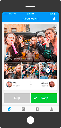 We use time, location, and our algorithm to tell you which friends have photos from when you were together. All you have to do is tap “Swap” to get the photos them.